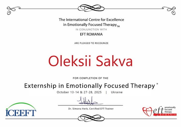 Член Міжнародної Асоціації Емоційно-Фокусованої Терапії (ICEEFT) https://iceeft.com/, продовжую навчання в цьому доказовому методі терапії пар та сімей.